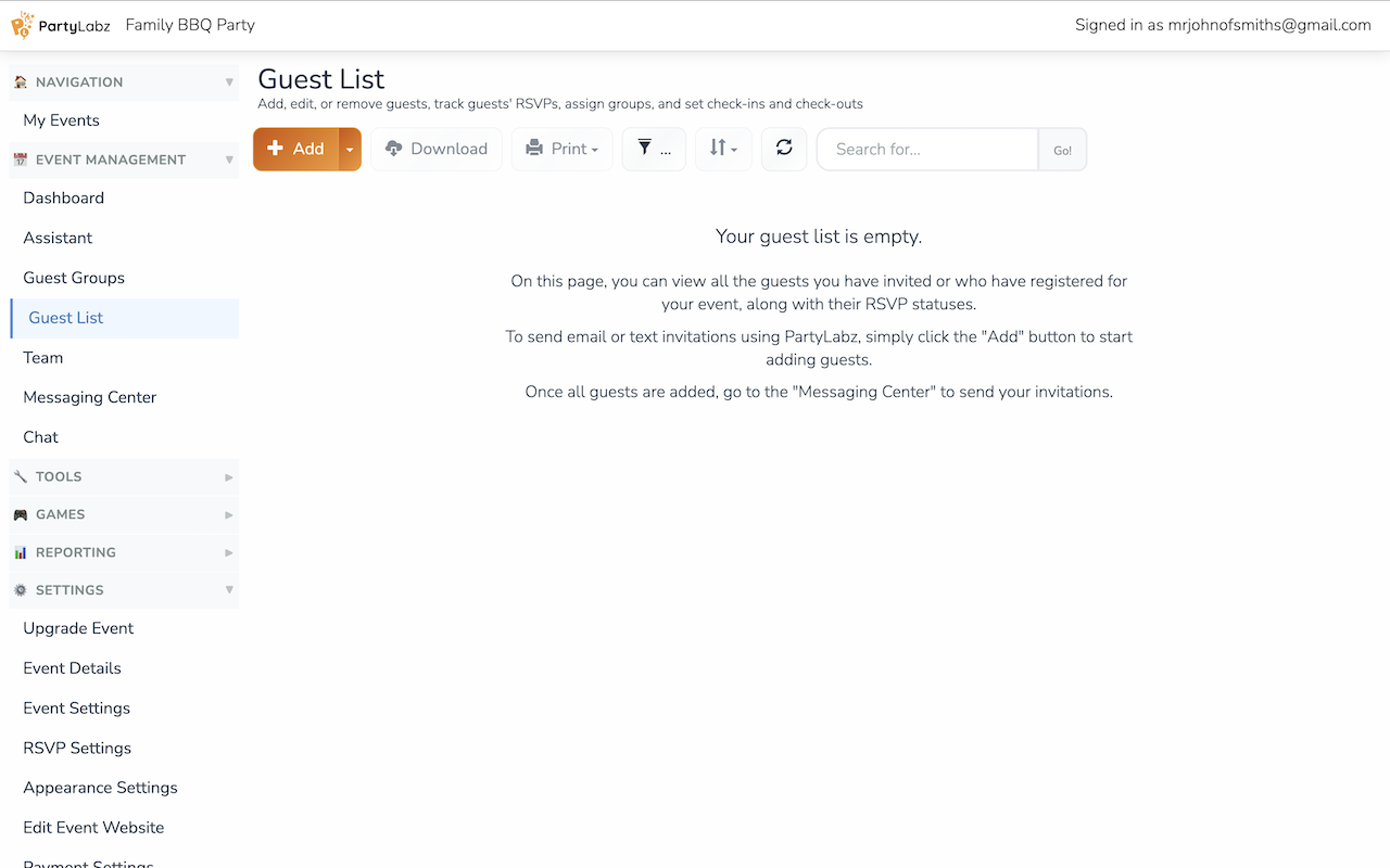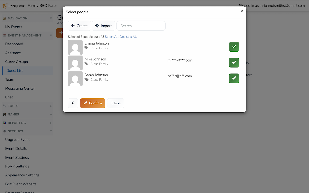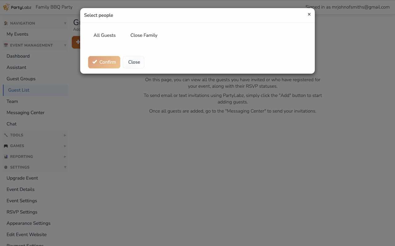This guide shows you how to use PartyLabz's guest list feature. You'll learn how to add people to your events, organize them into groups, and track who's coming to your party.