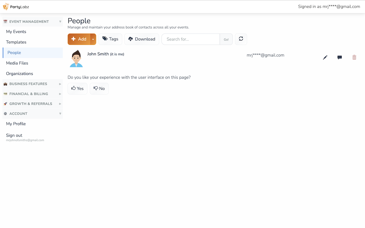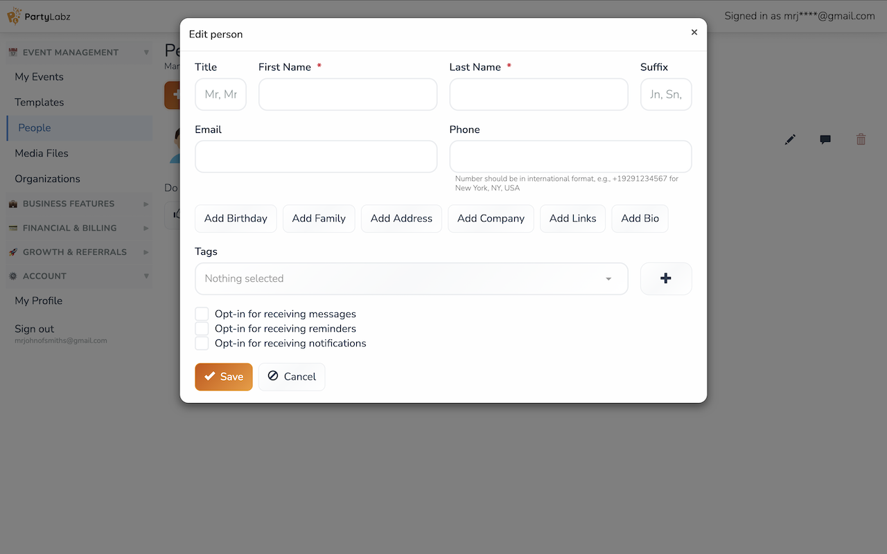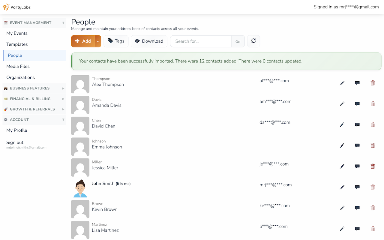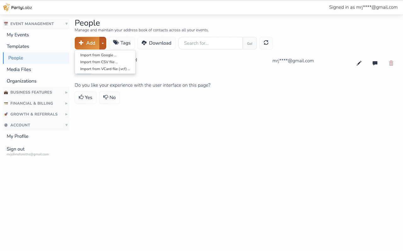 This guide shows you how to use PartyLabz's guest list feature. You'll learn how to add people to your events, organize them into groups, and track who's coming to your party.
