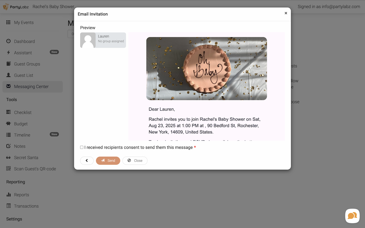 Head to the "Messaging Center" in your dashboard to start sending your email invites. The process is straightforward: