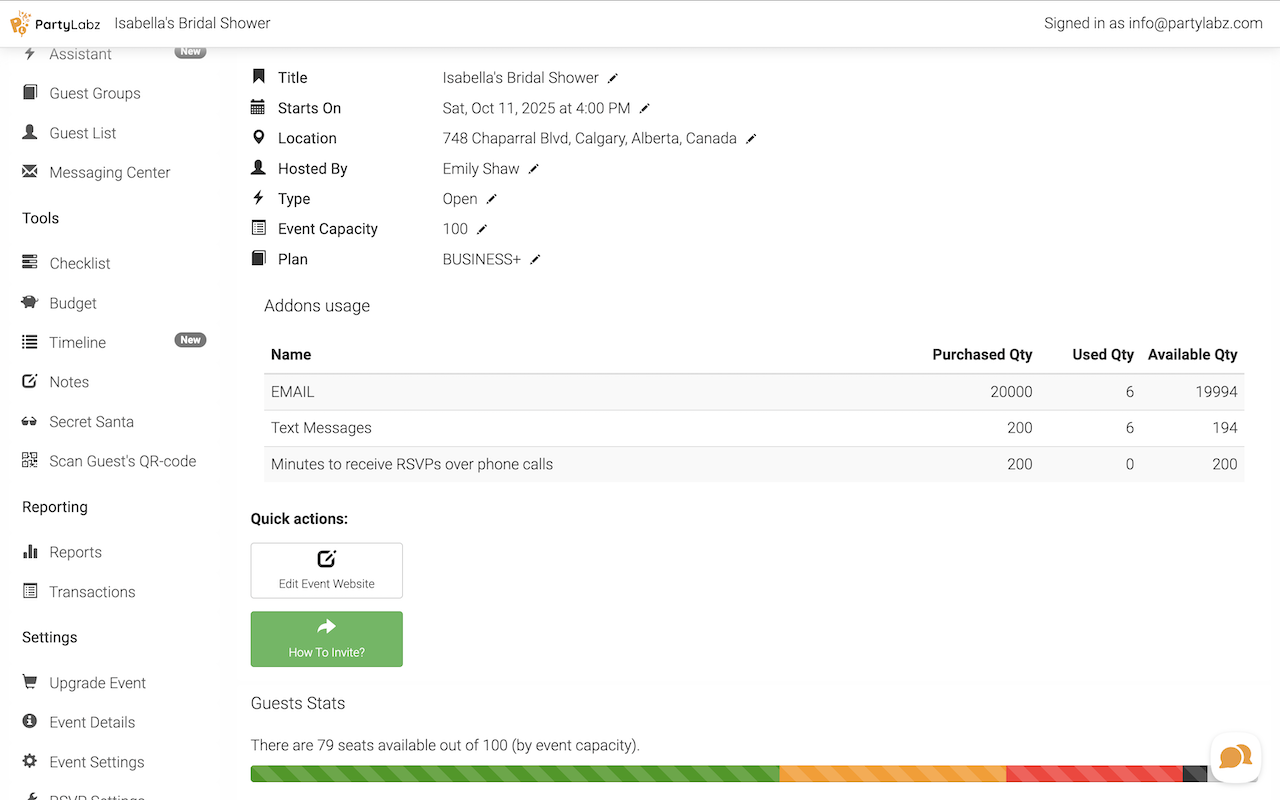 Keep track of everything right from your dashboard. Check your remaining messages under "view addons & usage," and monitor delivery status by clicking the eye icon next to sent invitations. Track RSVPs on your Dashboard (last 20) or get a complete overview on the Guest List page.