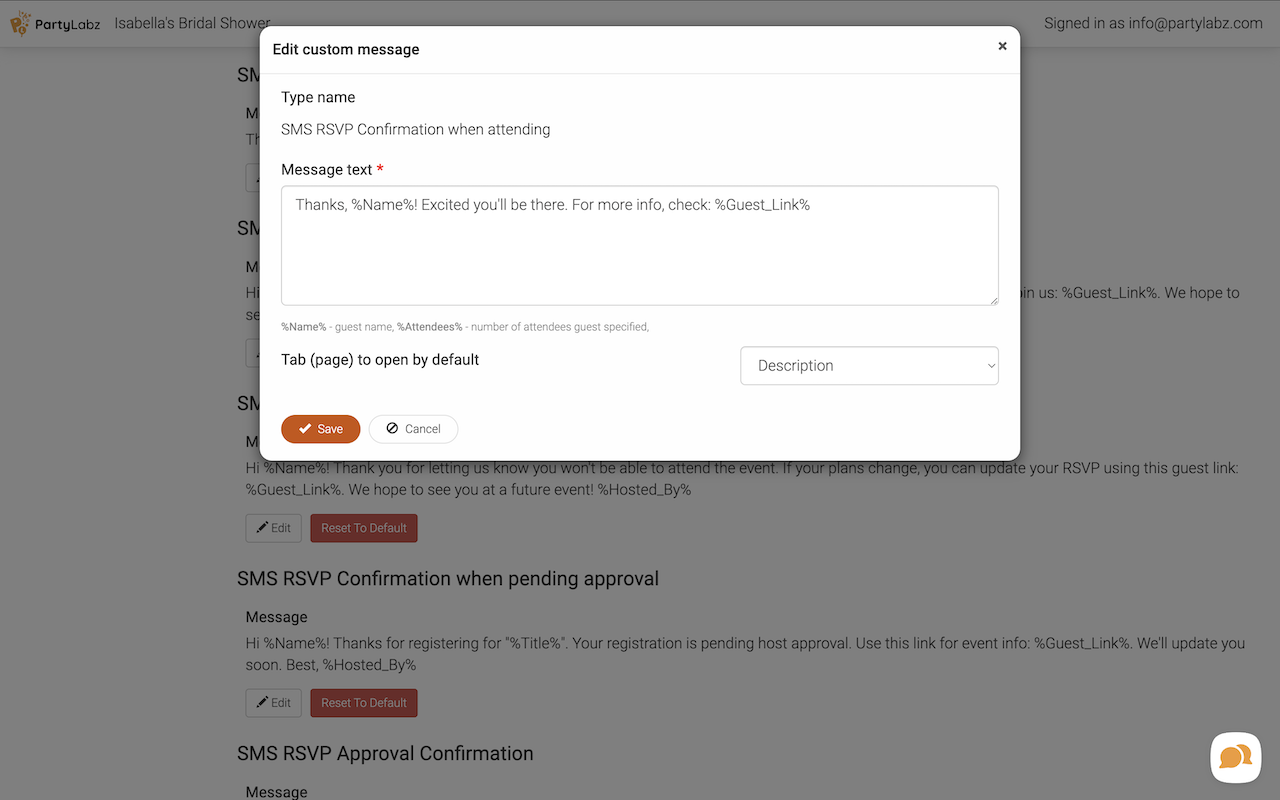 Remember: Always include the %Guest_Link% variable in your custom messages. This variable will be automatically replaced with the guest's personal link to your event website, ensuring they can always access the event details and update their RSVP if needed.