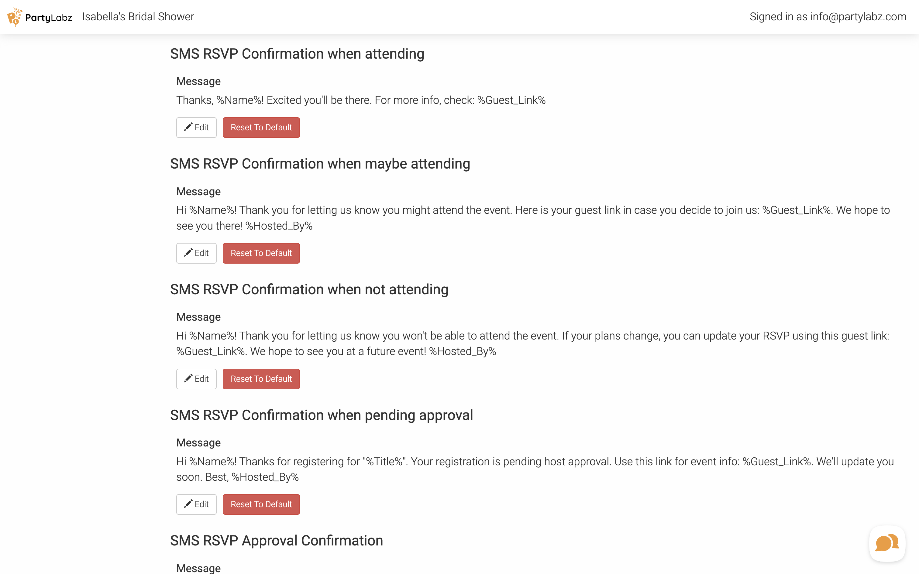 For PRO plan users and above, PartyLabz offers the ability to personalize the automatic responses guests receive when they RSVP via text message. This feature helps you maintain consistent communication and add a personal touch to your event management.