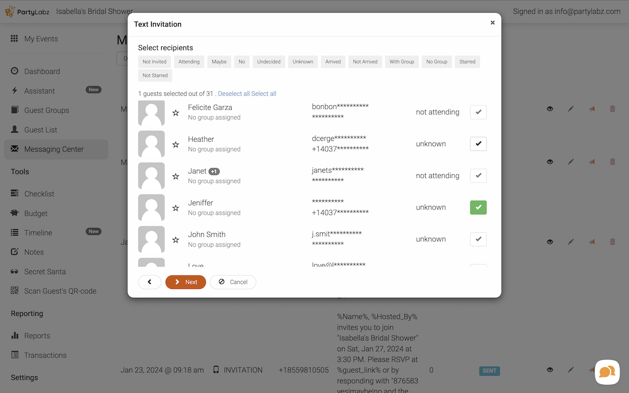 Important: If you have fewer available messages than the number of recipients, no text messages will be sent. Make sure to check your message balance and purchase additional add-ons if needed before sending invitations.