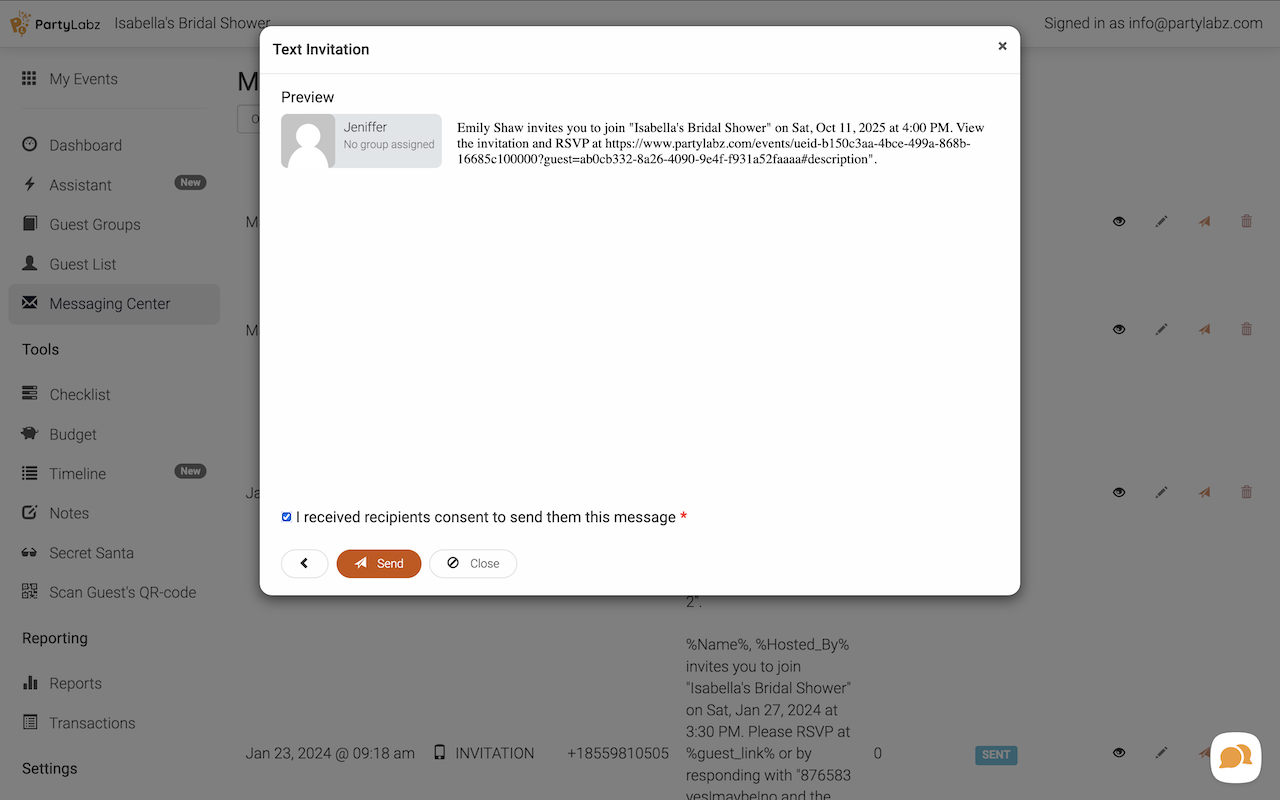 PartyLabz makes inviting guests to your events easy with its online invitations. Customize and track RSVPs, and enjoy seamless integration with your event website, ensuring a personalized and hassle-free experience for both hosts and guests.Text Invitations