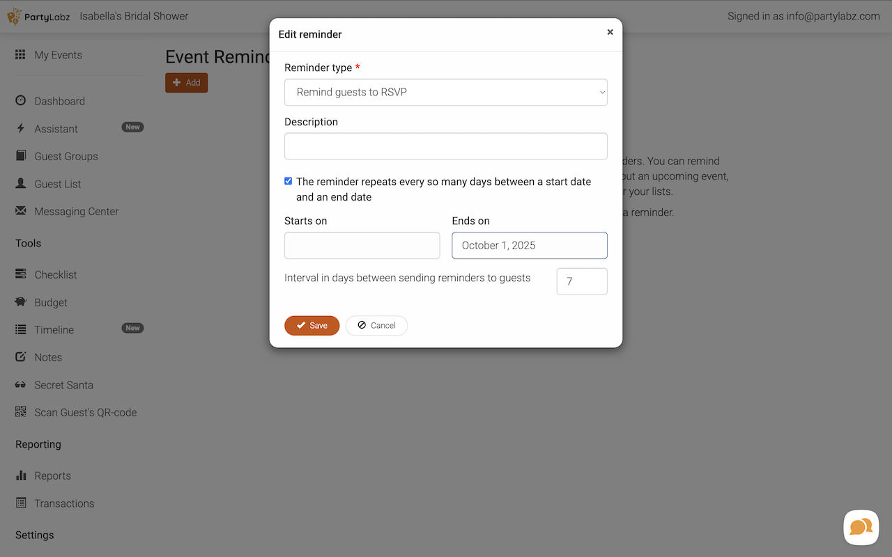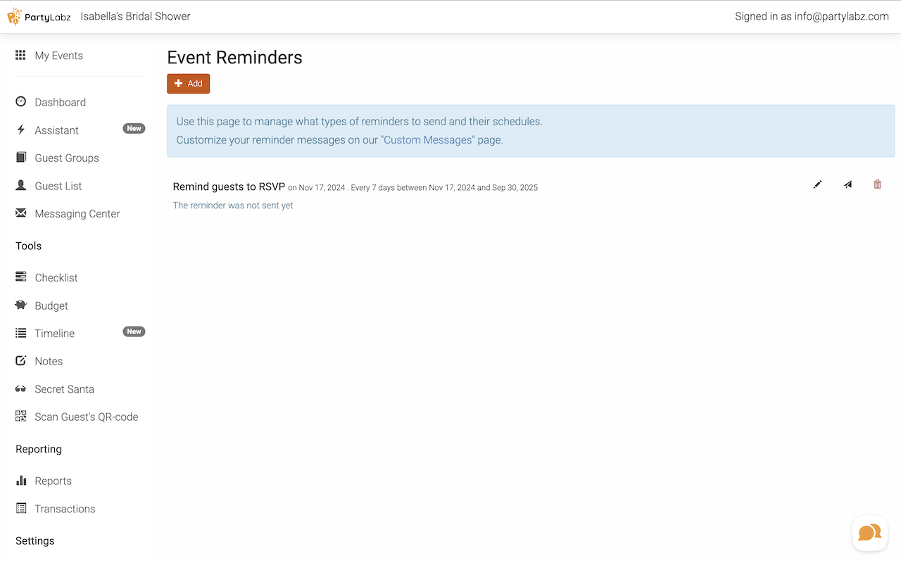 PartyLabz keeps your event on track with automatic text reminders sent to invited guests every 7 days. To customize the reminder schedule, go to the Reminders page and look for the "Reminder to RSVP" section. Click "Edit" to adjust the timing to your preference.